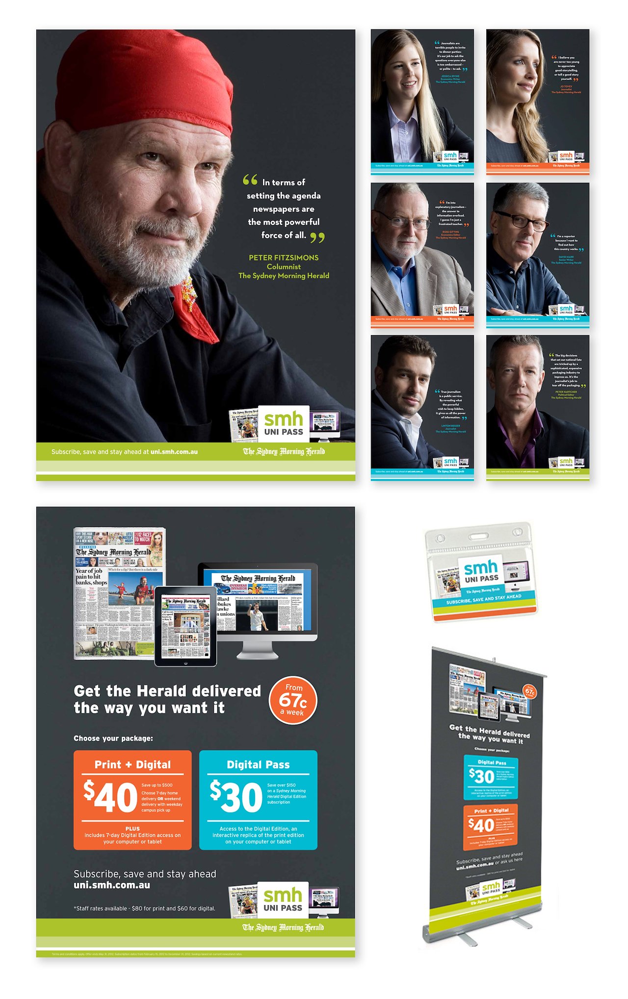 Concept, design & layout – SMH Uni Pass University Subscription campaign – all marketing collateral